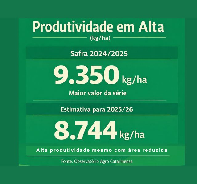 O rendimento médio das lavouras saltou de 7.201 quilos por hectare em 2015/16 para 9.350 quilos por hectare em 2024/25, o maior da série histórica. Para 2025/26, a estimativa indica manutenção de patamares elevados, reforçando que o futuro do milho catarinense está cada vez mais ligado à eficiência produtiva do que à expansão da área cultivada.