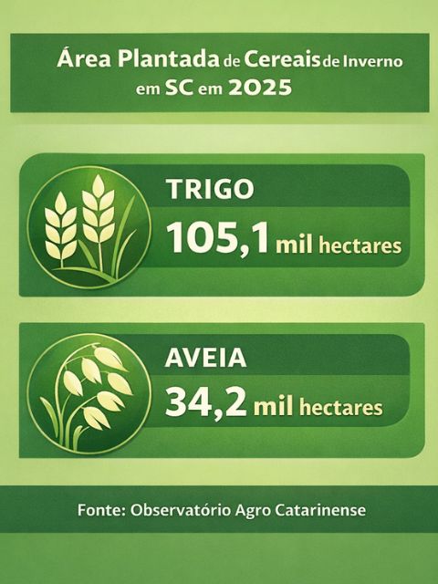 A safra catarinense de cereais de inverno chega ao fim marcada por trajetórias distintas entre trigo, aveia e cevada. A combinação de preços pressionados no mercado internacional e menor atratividade econômica reduziu a área cultivada com trigo no estado. Por outro lado, aveia e cevada se constituem em alternativas de inverno importantes para geração de renda, diversificação da produção e conservação de solo.