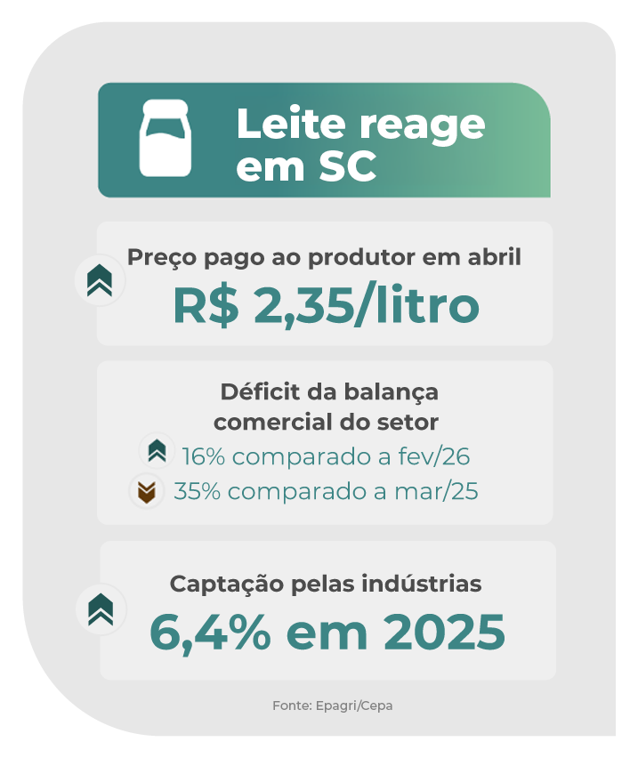 A analista da Epagri/Cepa, Andrea Castelo Branco, avalia que a recuperação dos preços do leite ao produtor, a partir de fevereiro de 2026, ocorre após oito meses de queda provocados principalmente pelo aumento da oferta. Em 2025, a captação nacional cresceu 8,4%, ampliando a disponibilidade interna e pressionando os valores pagos, enquanto as importações, apesar de contribuírem para o aumento da oferta, tiveram influência menor por ficarem abaixo do volume registrado em 2024.