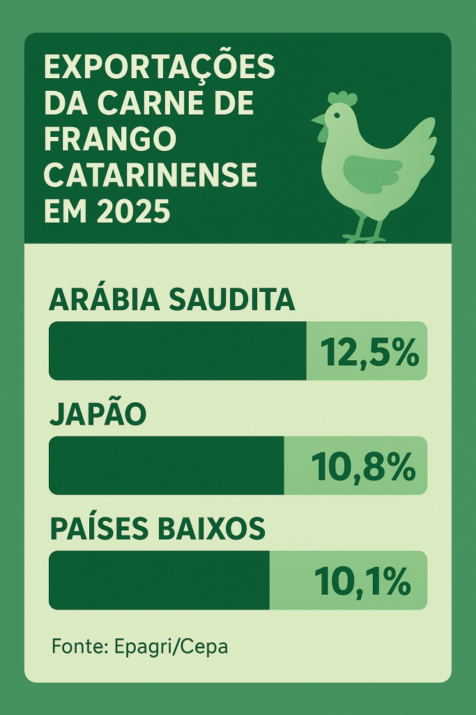 O analista da Epagri/Cepa reforça o papel estratégico da diversificação como fator de resiliência e competitividade do agronegócio catarinense no mercado internacional. “Mesmo diante do embargo temporário imposto por diversos países à carne de frango brasileira após o foco de influenza aviária registrado no Rio Grande do Sul, Santa Catarina manteve excelentes níveis de exportação, alcançando o melhor resultado da série histórica em receita no acumulado de janeiro a outubro de 2025.”