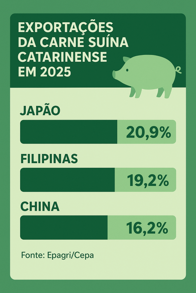 O Japão consolidou-se como o principal destino da carne suína catarinense, respondendo por 20,9% da receita total, seguido por Filipinas (19,2%) e China (16,2%). O destaque vai para o México, que subiu ao quarto lugar no ranking, com crescimento acima de 60% nas vendas para aquele país.